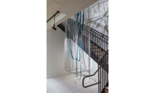This textile sculpture is made of handwoven and hand-dyed repurposed materials. Inspired by the root systems of the region's native flora and the earth’s layers, it references all the new growth (both physical and metaphorical) that will take root within the surrounding homes and communities.